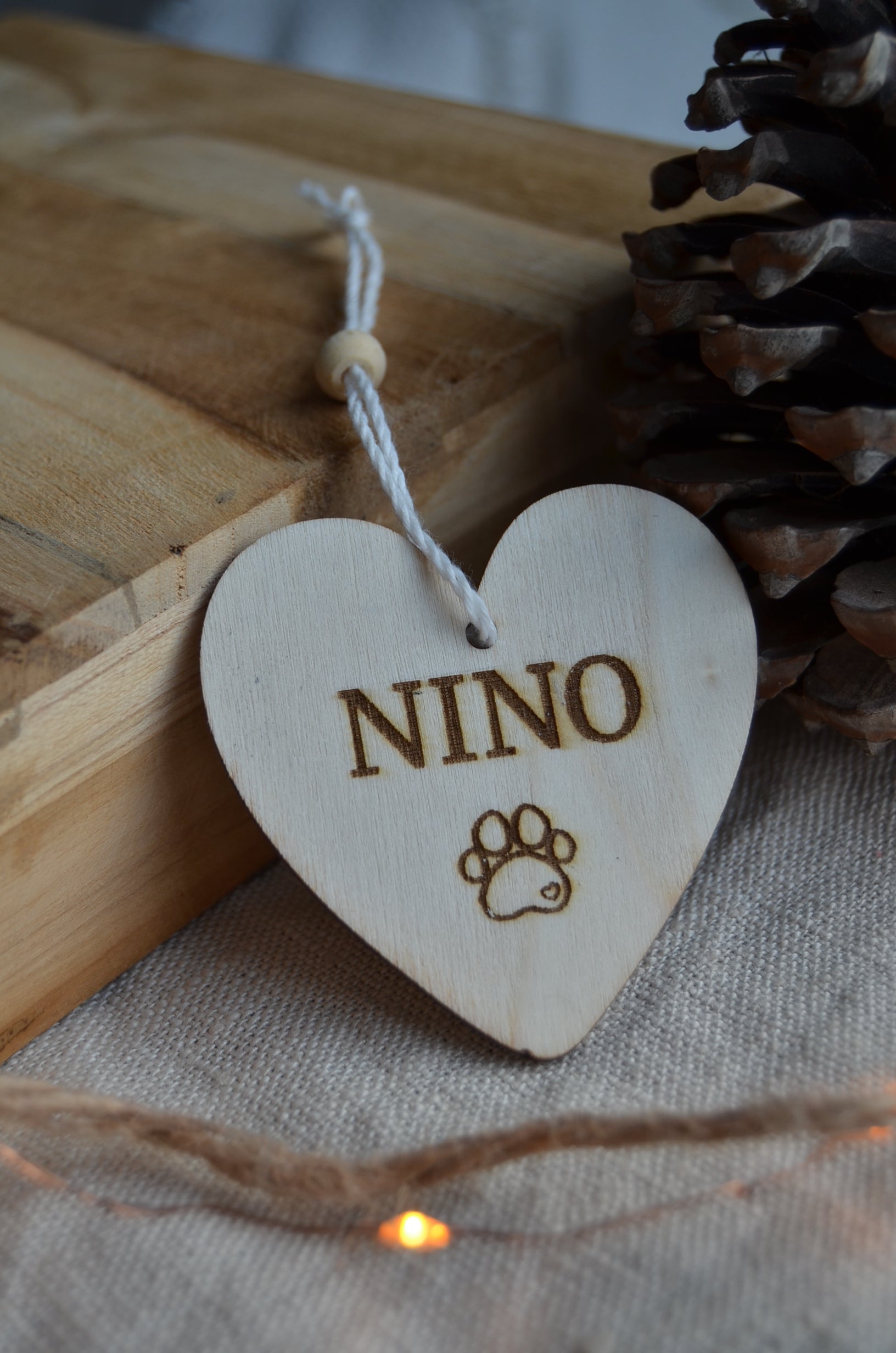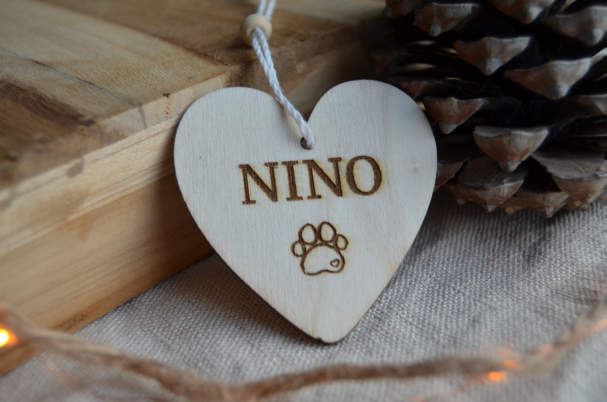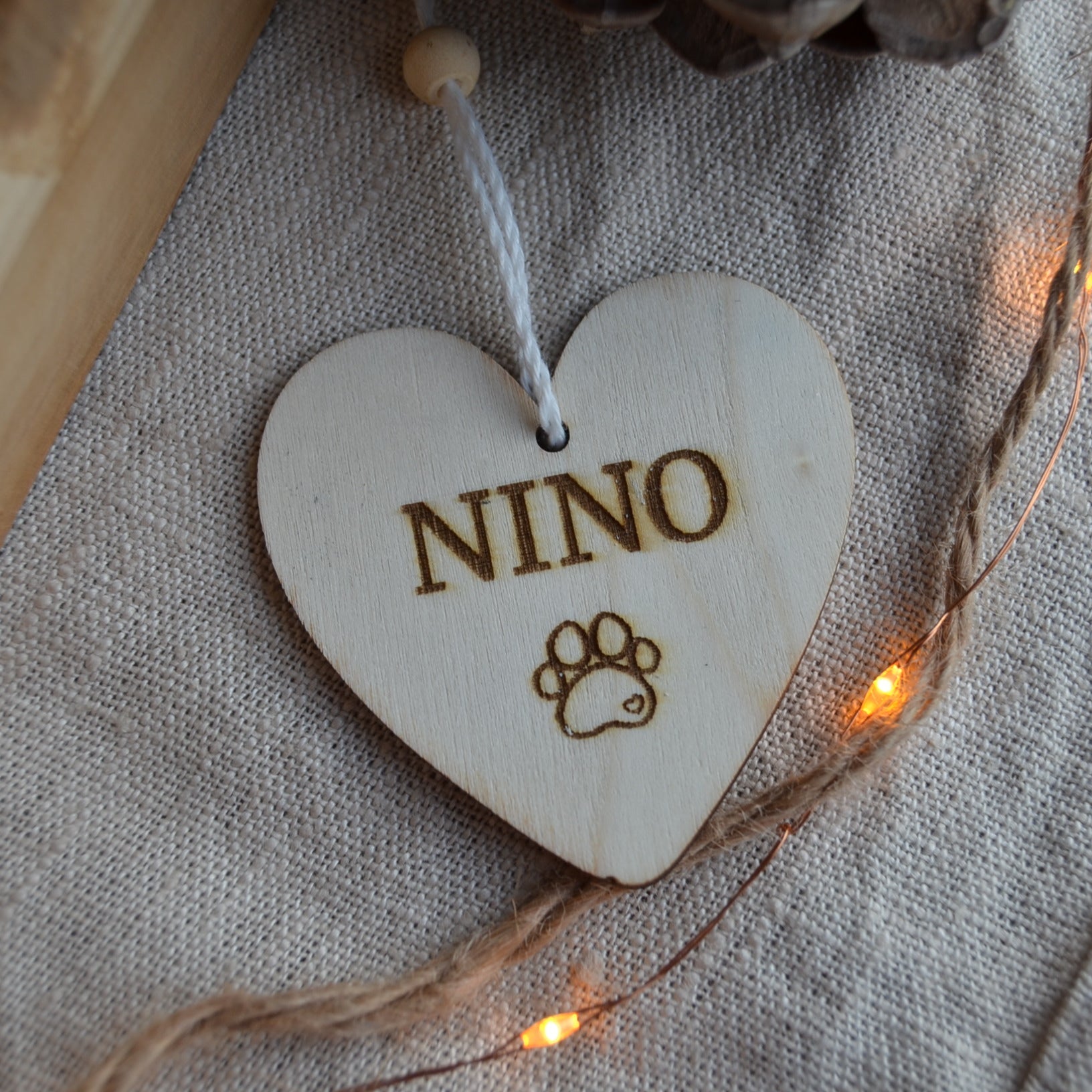 Offrez un souvenir unique pour garder le nom de votre animal dans votre sapin ! Cette jolie décoration de sapin en forme de coeur 6 X 6cm est gravée avec le prénom de votre loulou. Chaque gravure est réalisée avec soin dans notre atelier, pour un cadeau à la fois chaleureux et durable.