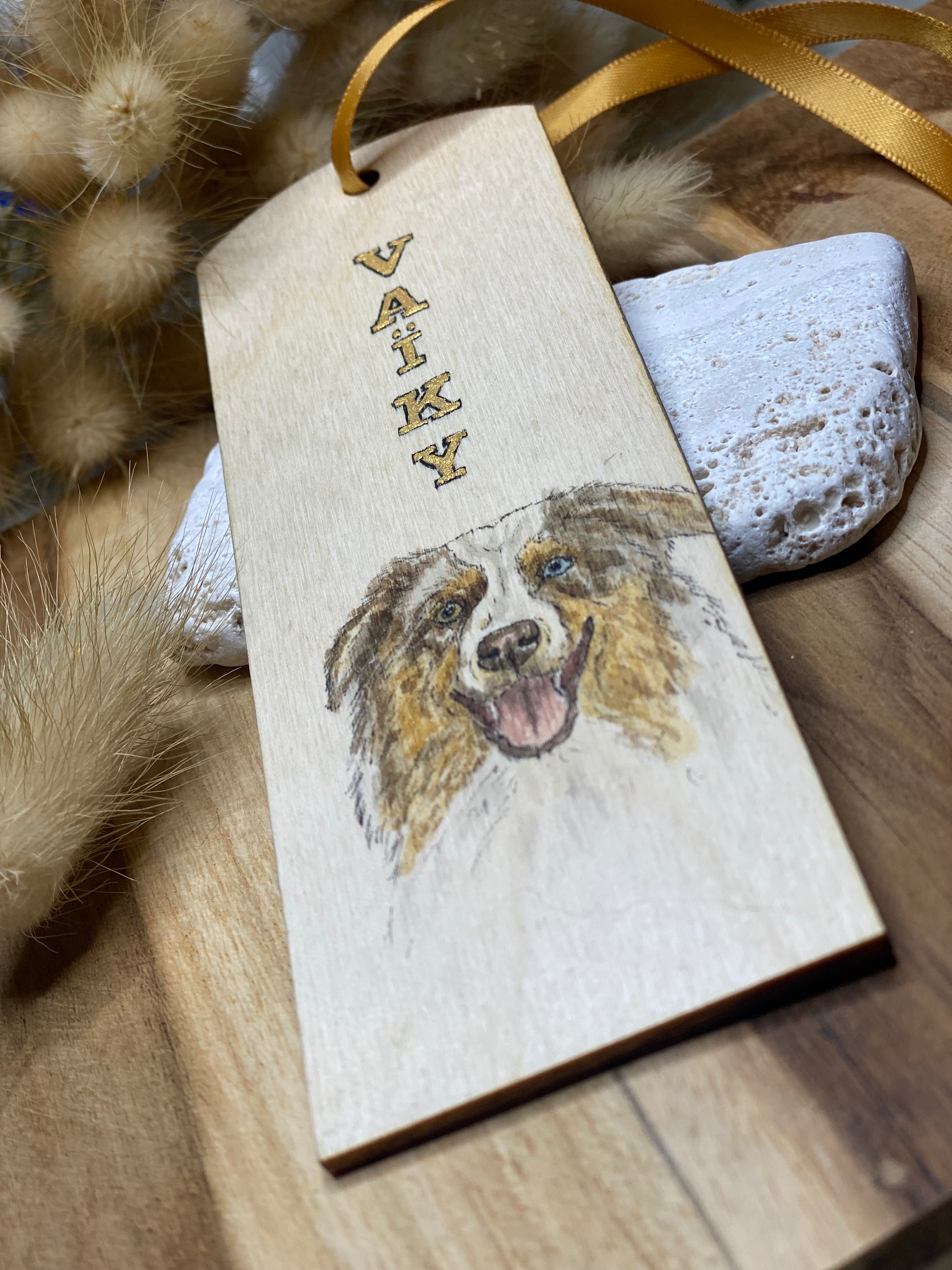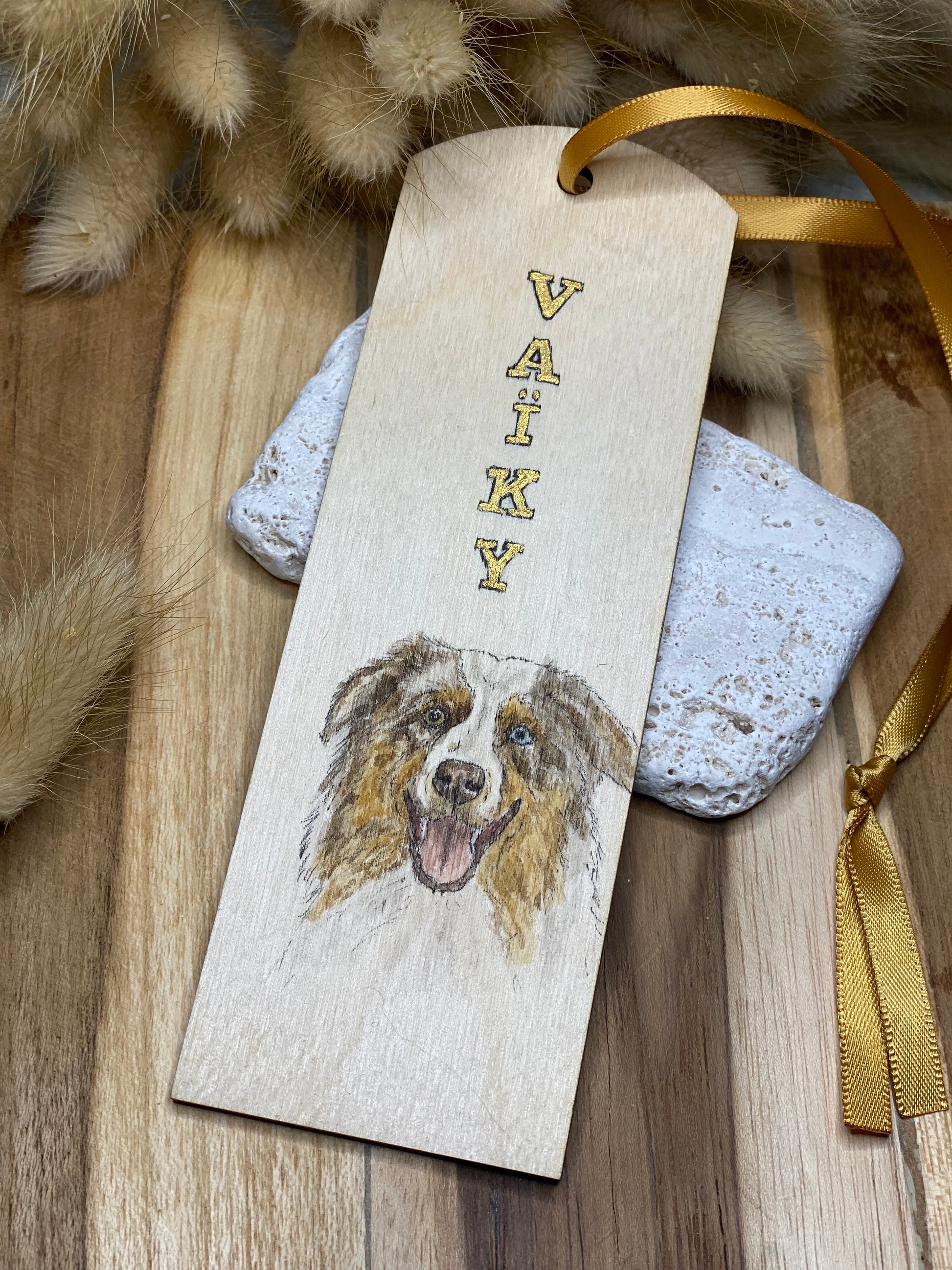 Ce marque-page en bois de bouleau (dim : 15 x 5 cm) est personnalisé avec un portrait peint à la main, pour un rendu unique et plein d'émotion.