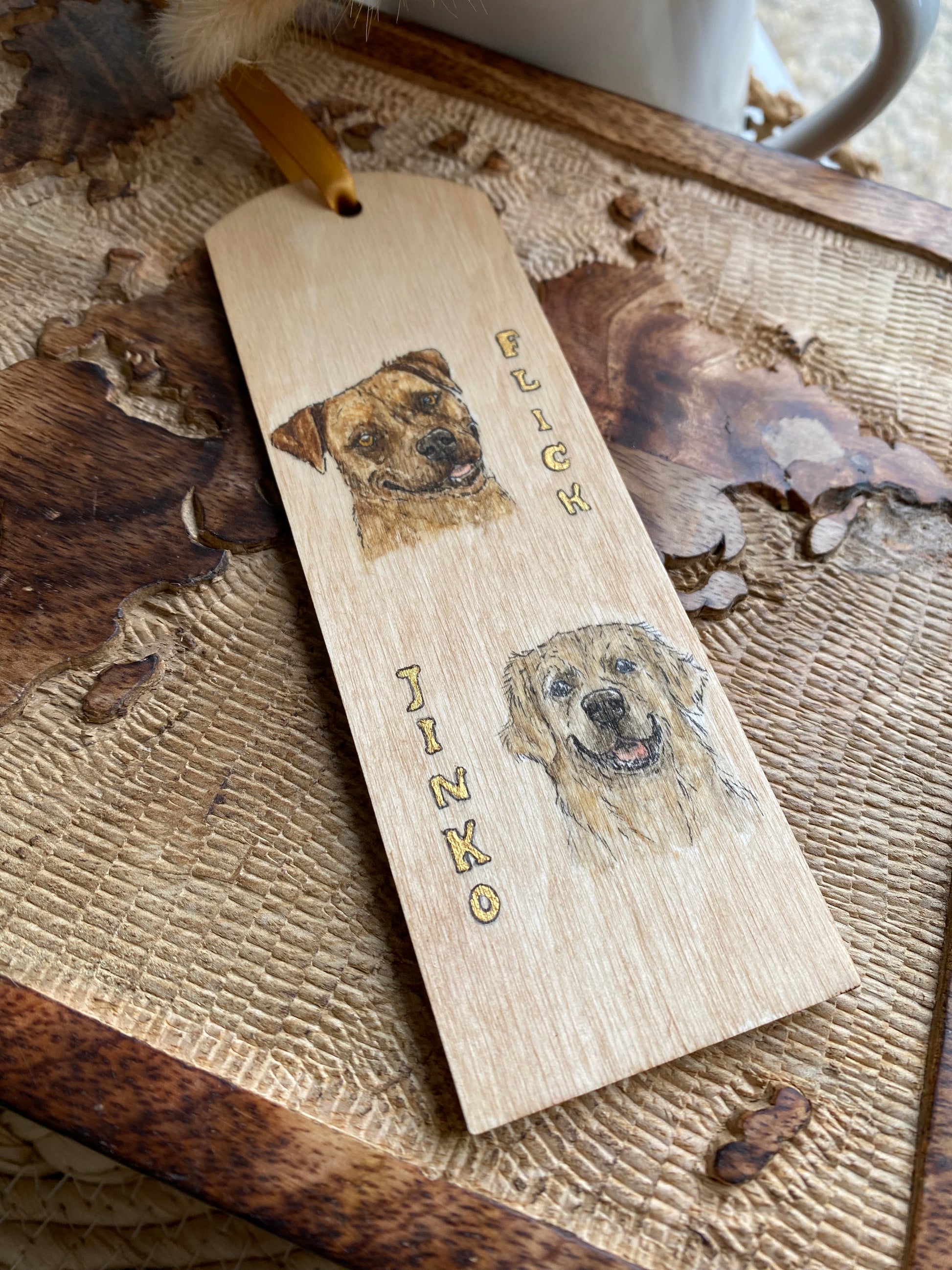Ce marque-page en bois de bouleau (dim : 15 x 5 cm) est personnalisé avec deux portraits peint à la main, pour un rendu unique et plein d'émotion.