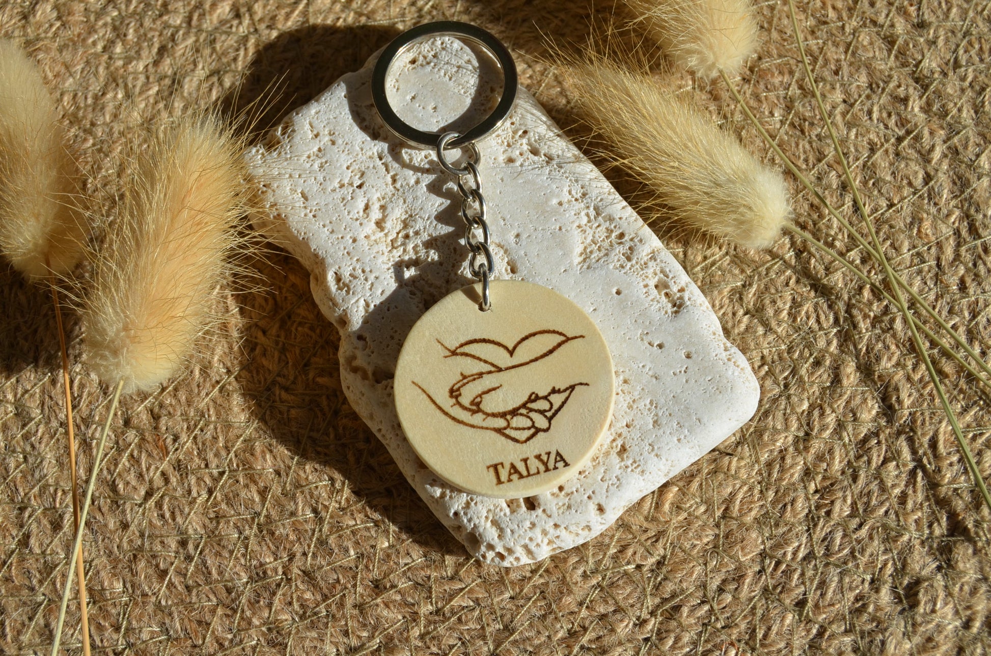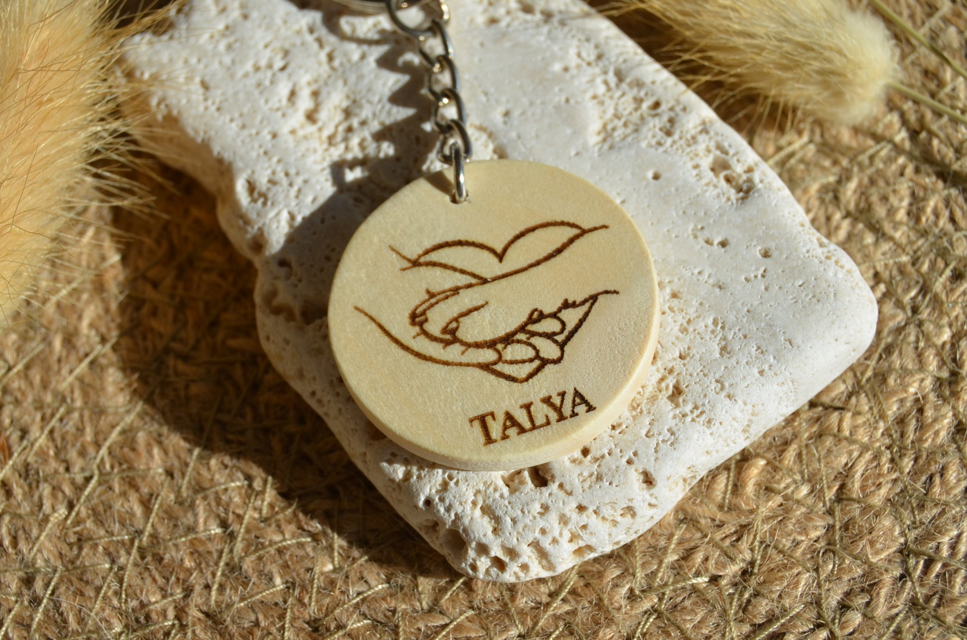 Ce porte-clés en bois gravé au laser représente une main tenant la patte d’un chien, accompagné du prénom de votre animal.